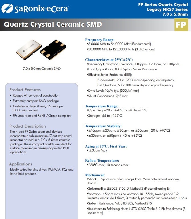 百利通亞陶晶振,FP系列7050mm晶振,FP0800056Z無源晶振,FP0730017Z石英晶體,電腦用晶振